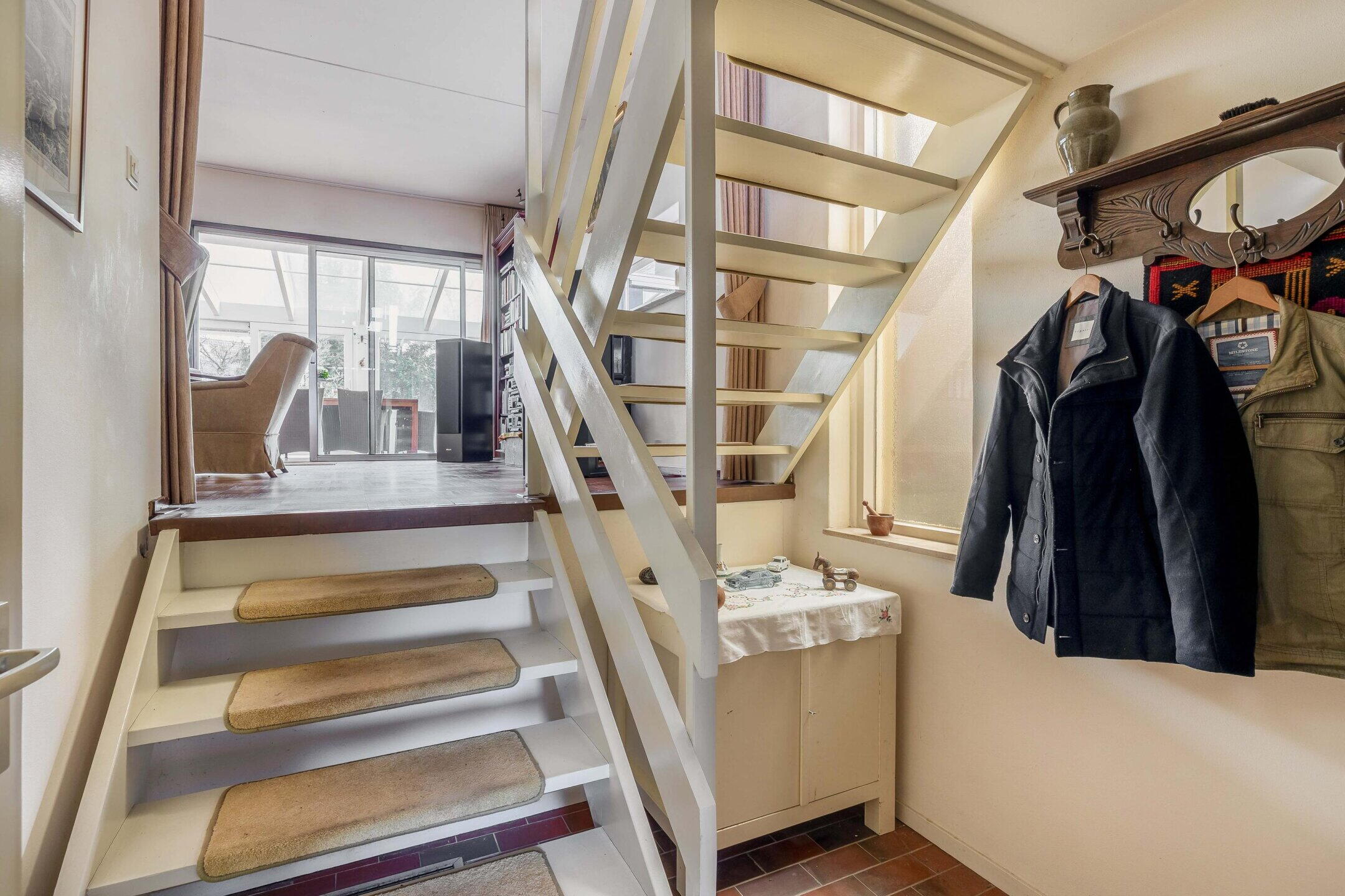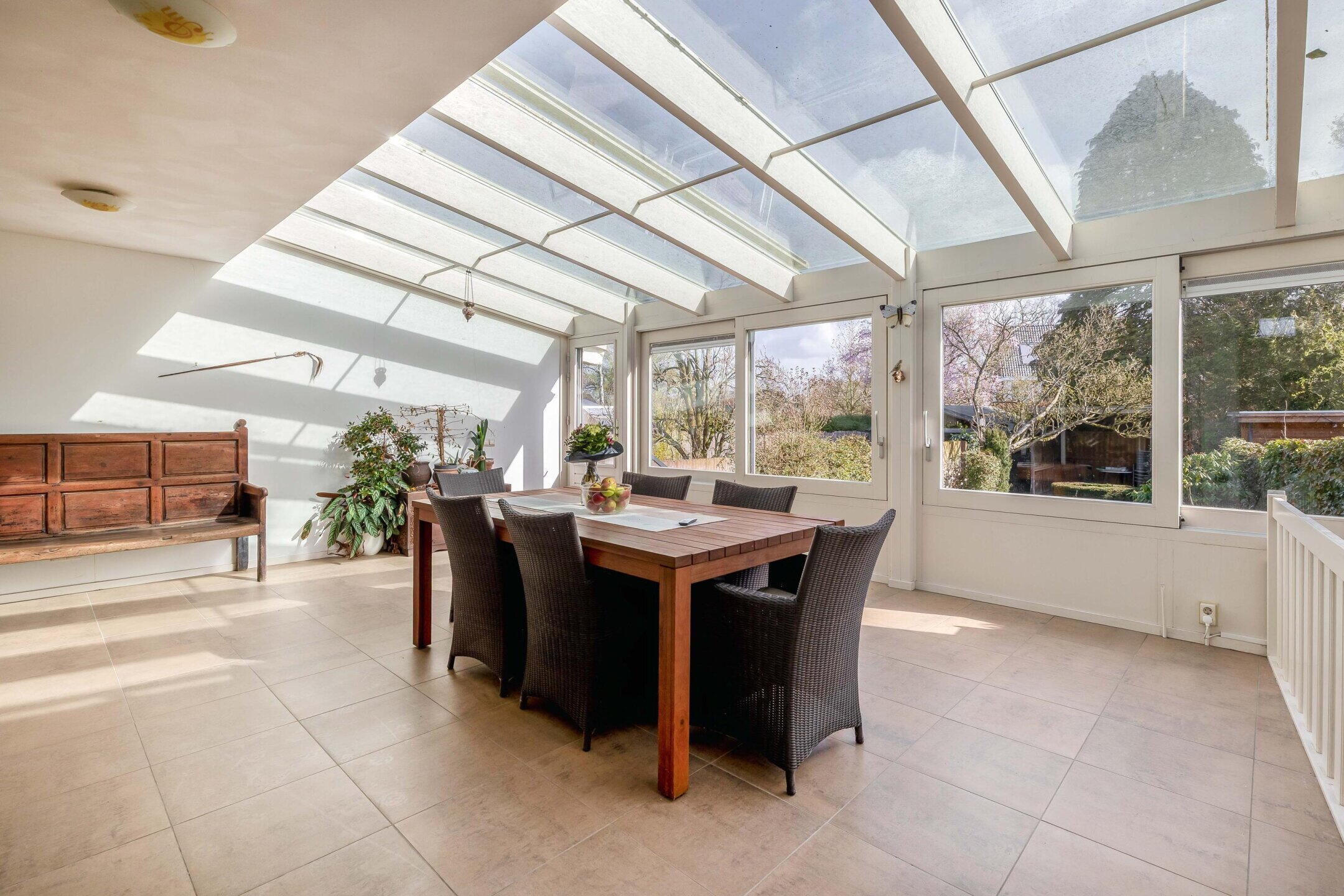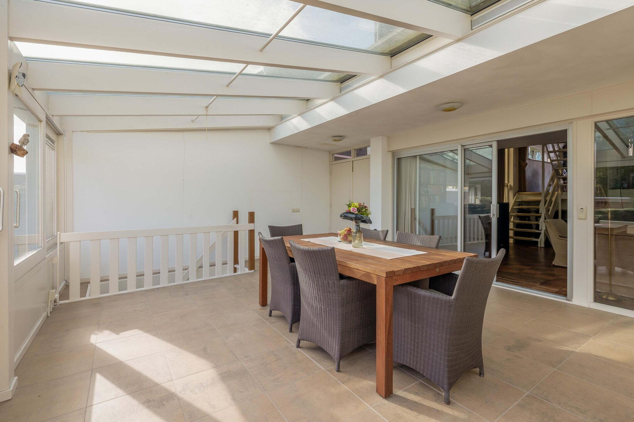 Aansluitend aan de woonkamer bevindt zich de serre, een fijne extra leefruimte waar je heerlijk kunt zitten en genieten van het uitzicht op de tuin. Door de grote glaspartijen is dit een lichte ruimte waar binnen en buiten mooi in elkaar overlopen. De serre kan bijvoorbeeld worden ingericht als extra zithoek, werkplek of plek om te ontspannen. Vanuit de serre kun je via een trap naar beneden zowel naar de kelder als naar de heerlijke achtertuin.