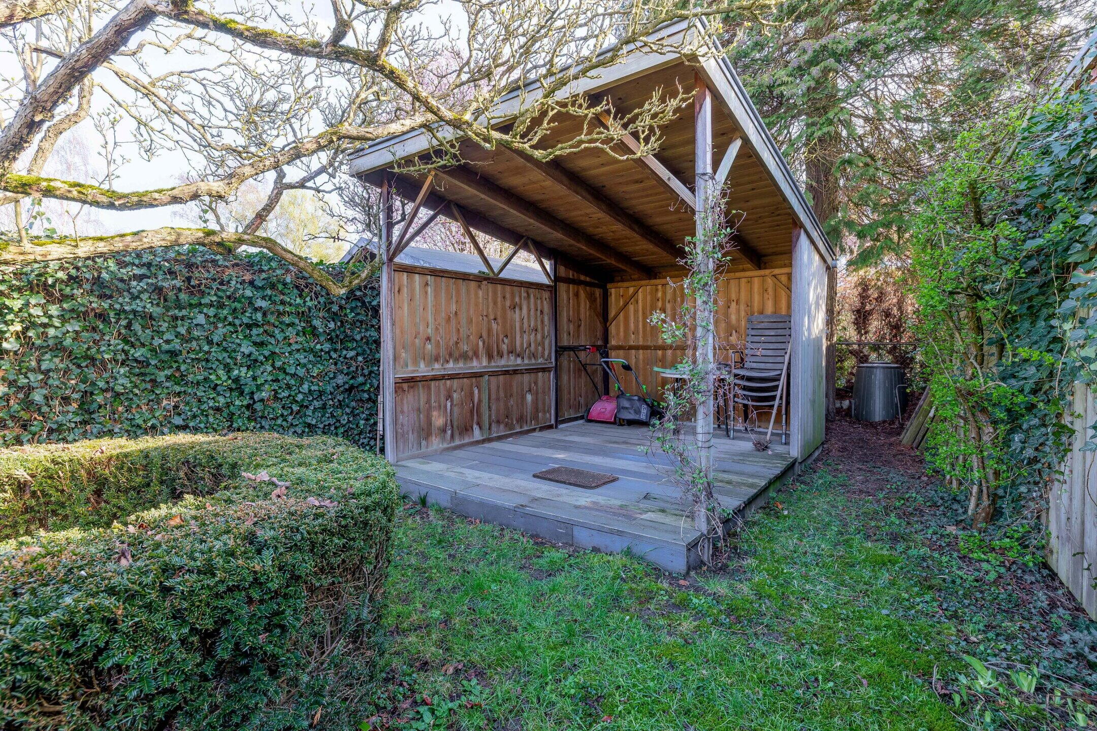 Daarnaast is er een vrijstaande houten berging aanwezig, ideaal voor het stallen van fietsen of tuingereedschap.