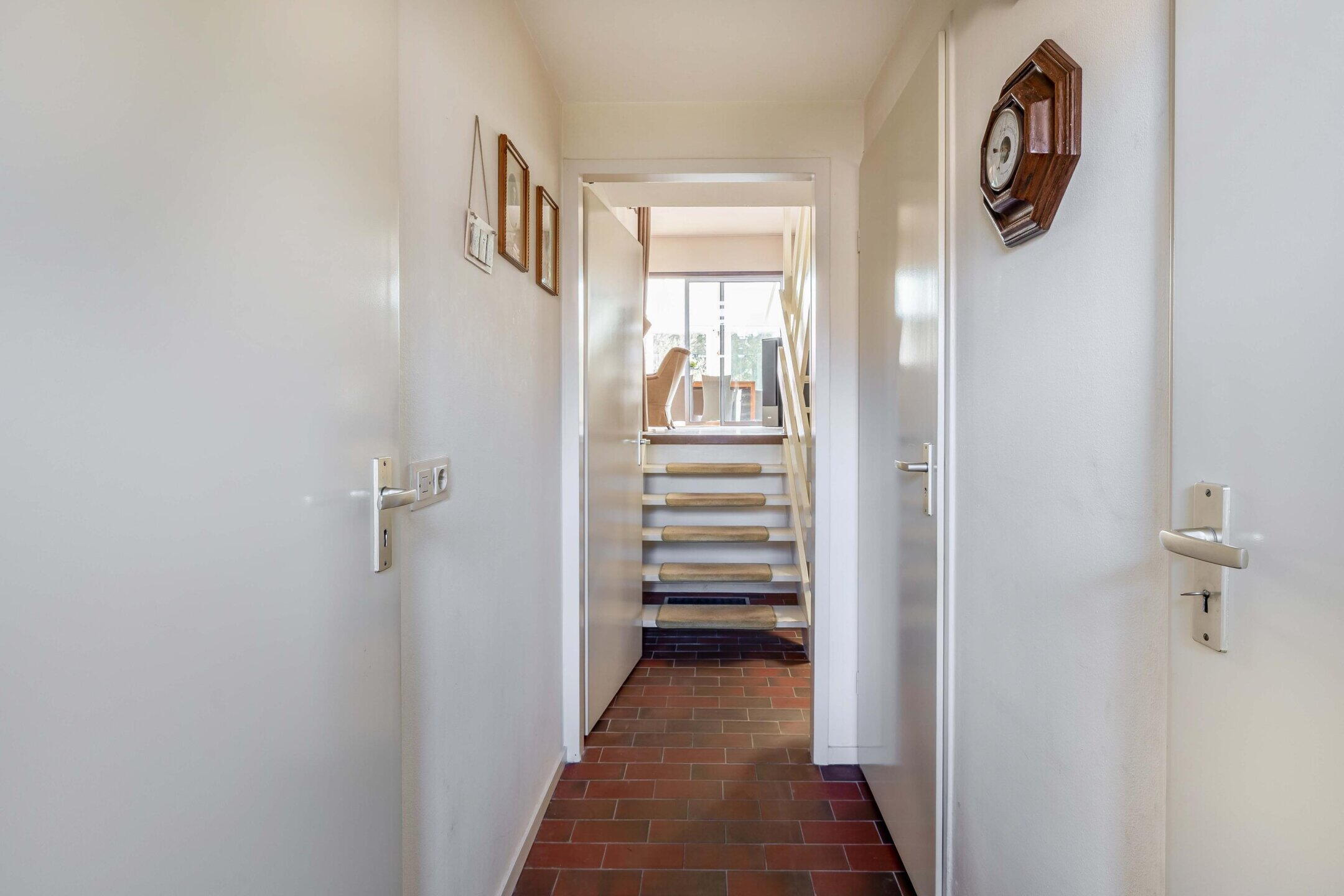 Via de voordeur betreed je de woning in de entreehal. Hier bevinden zich de meterkast, het toilet en de toegang tot de inpandige garage. Vanuit de entree kom je in een hal met toegang tot de trap naar de woonkamer.